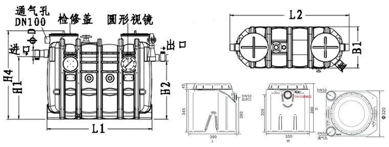 產品特點:澤德油水分離器采用PE箱體 耐腐蝕 緊湊的橢圓形設計 理由油脂分離和沉降,設有圓形視鏡和檢修口等